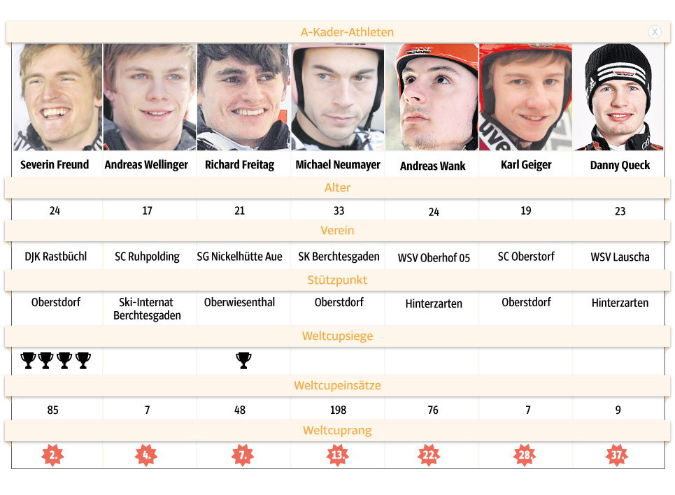 Oberstdorf, Berchtesgaden, Furtwangen, Winterberg/Willingen, Oberhof, Oberwiesenthal, Klingenthal4 Stützpunkte